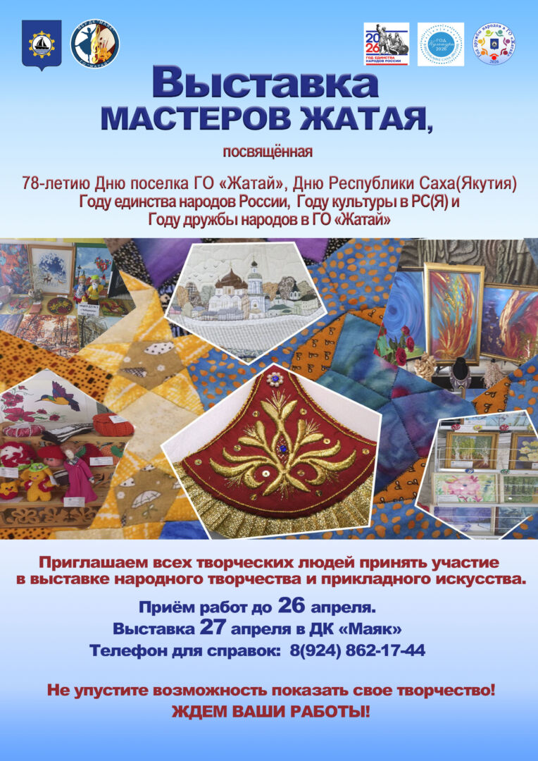 Приглашаем всех, кто чтит народное творчество и прикладное искусство, принять участие в выставке «МАСТЕРОВ ЖАТАЯ». Мероприятие приурочено к знаменательным датам: 78‑летие посёлка Жатай, День Республики Саха (Якутия), Год единства народов России, Год культуры в РС(Я), Год дружбы народов в ГО «Жатай». Это прекрасная возможность продемонстрировать богатство культурных традиций нашего края и передать их следующим поколениям. Приём работ: до 26 апреля; Выставка: 27 апреля в ДК «Маяк»📞 Телефон для справок: 8 (924) 862‑17‑44 Пусть ваше творчество станет частью большой истории Жатая! Ждём ваши работы.