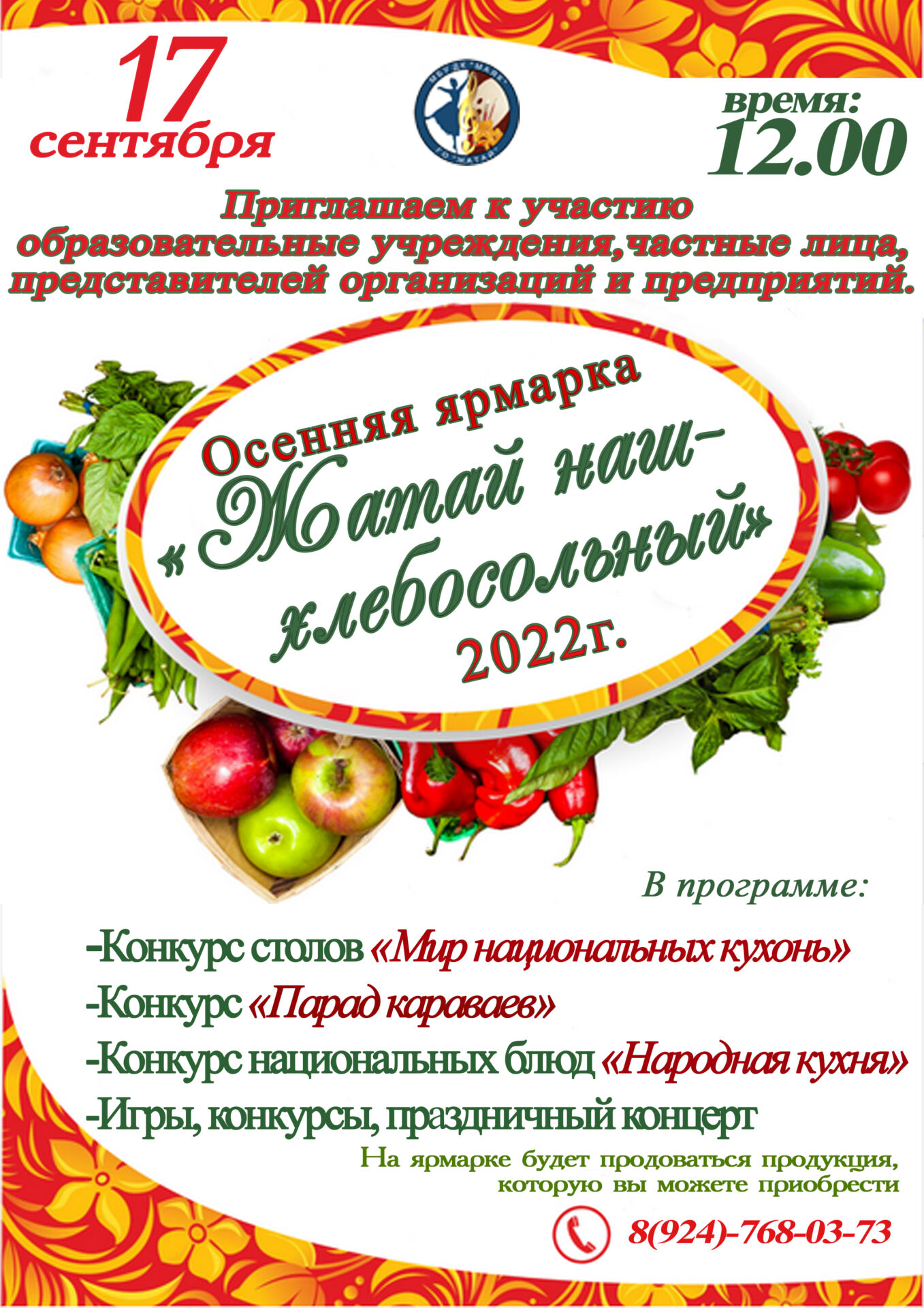 6.1. Заявки на участие в осенней ярмарке «Жатай – наш хлебосольный» подаются до 15 сентября 2022г. по адресу: п. Жатай, ул. Строда 1/1, ДК «Маяк», кабинет №7, e-mail: shiryaeva_aleksa@bk.ru