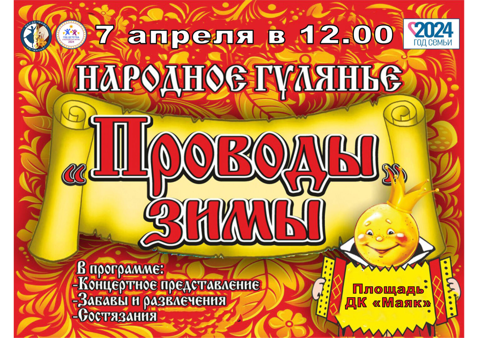 7 апреля пройдет народное гулянье «Проводы зимы». Ждем Вас к 12.00 на площади ДК «Маяк», на настоящий русский ...