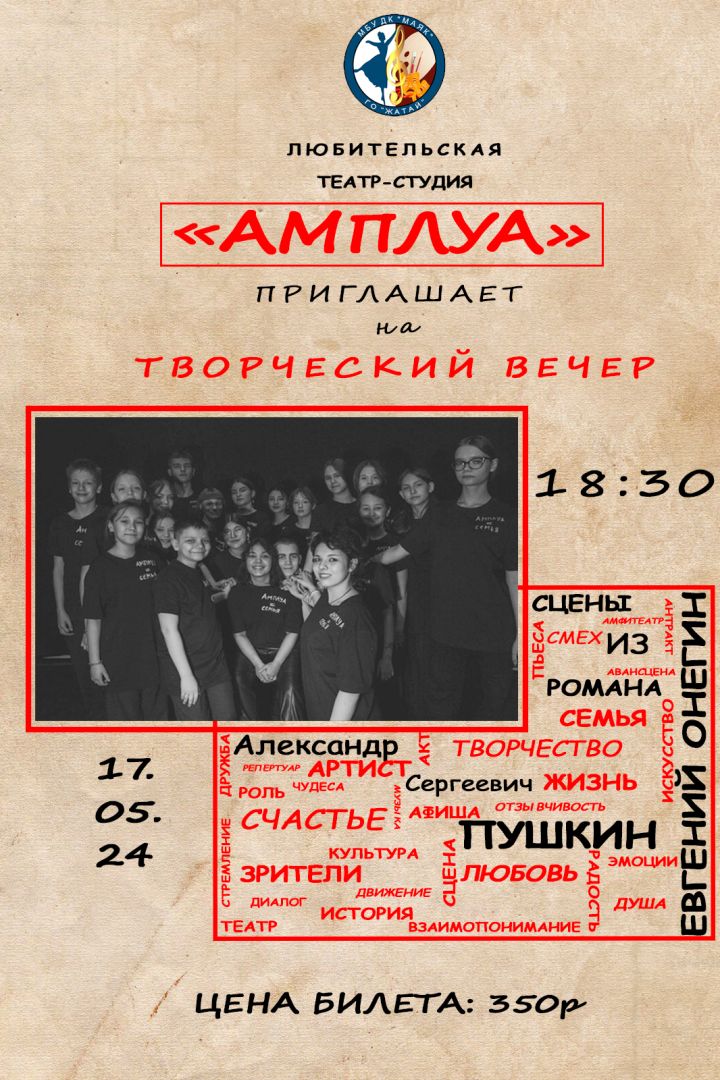 Любительская театр-студия «Амплуа» приглашает на творческий вечер 17 мая в 18.30 в ДК «Маяк». Цена билета — 350 ...
