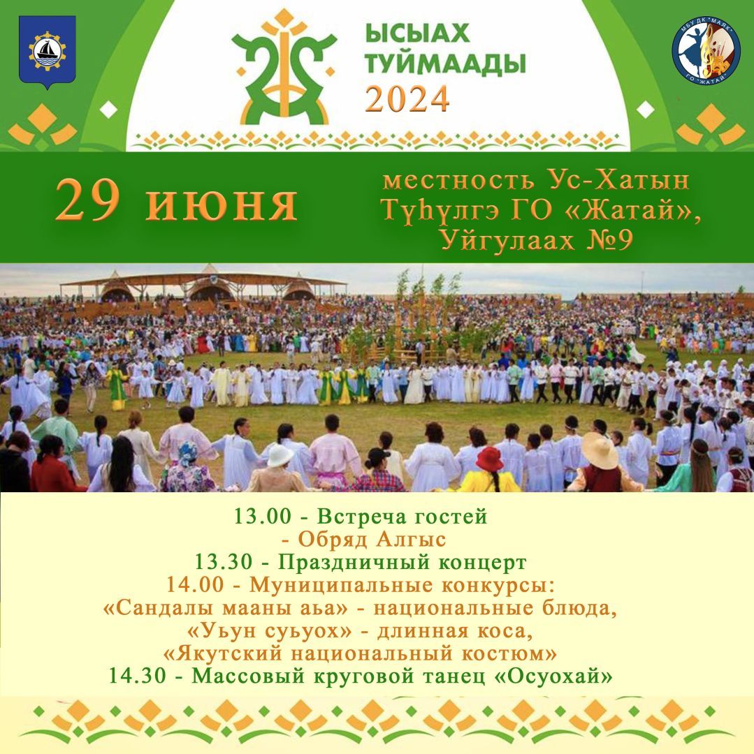 местность Ус-Хатын Түһүлгэ ГО «Жатай», Уйгулаах № 9 13.00 — Встреча гостейОбряд Алгыс13.30 — Праздничный концерт14.00 — Муниципальные ...