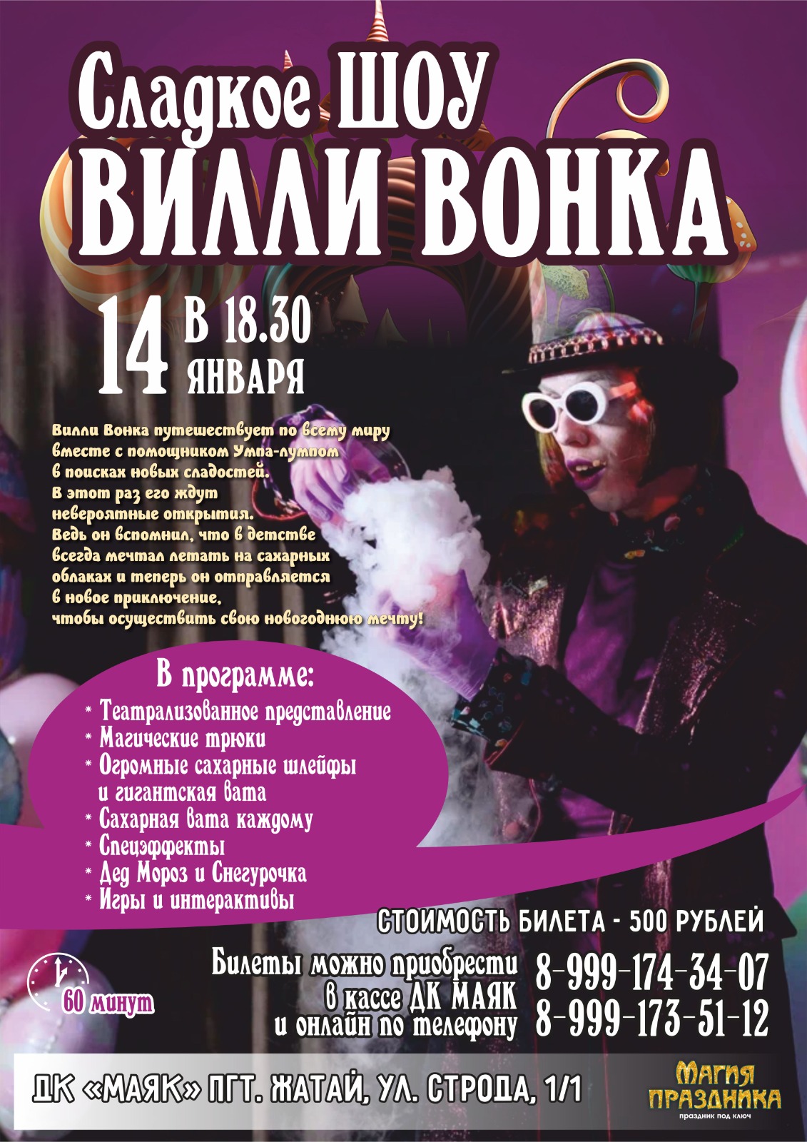 14 января в 18.30 в ДК «Маяк» пройдет «Сладкое ШОУ ВИЛЛИ ВОНКА». Вилли Вонк путешествует по всему миру ...