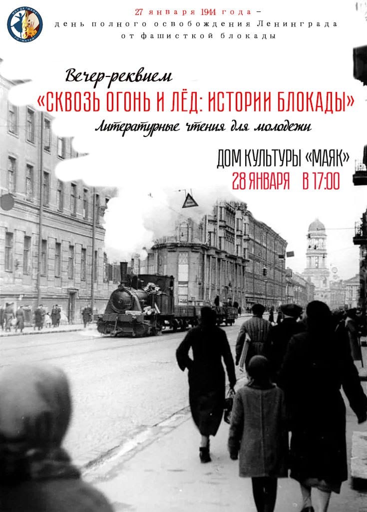 28 января в 17:00 в малом зале Дома культуры «Маяк» пройдёт вечер-реквием «Сквозь огонь и лёд: Истории блокады» ...