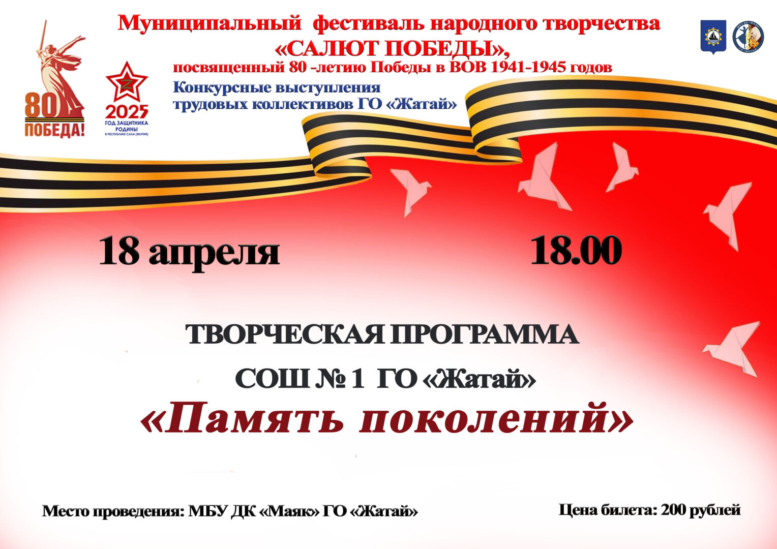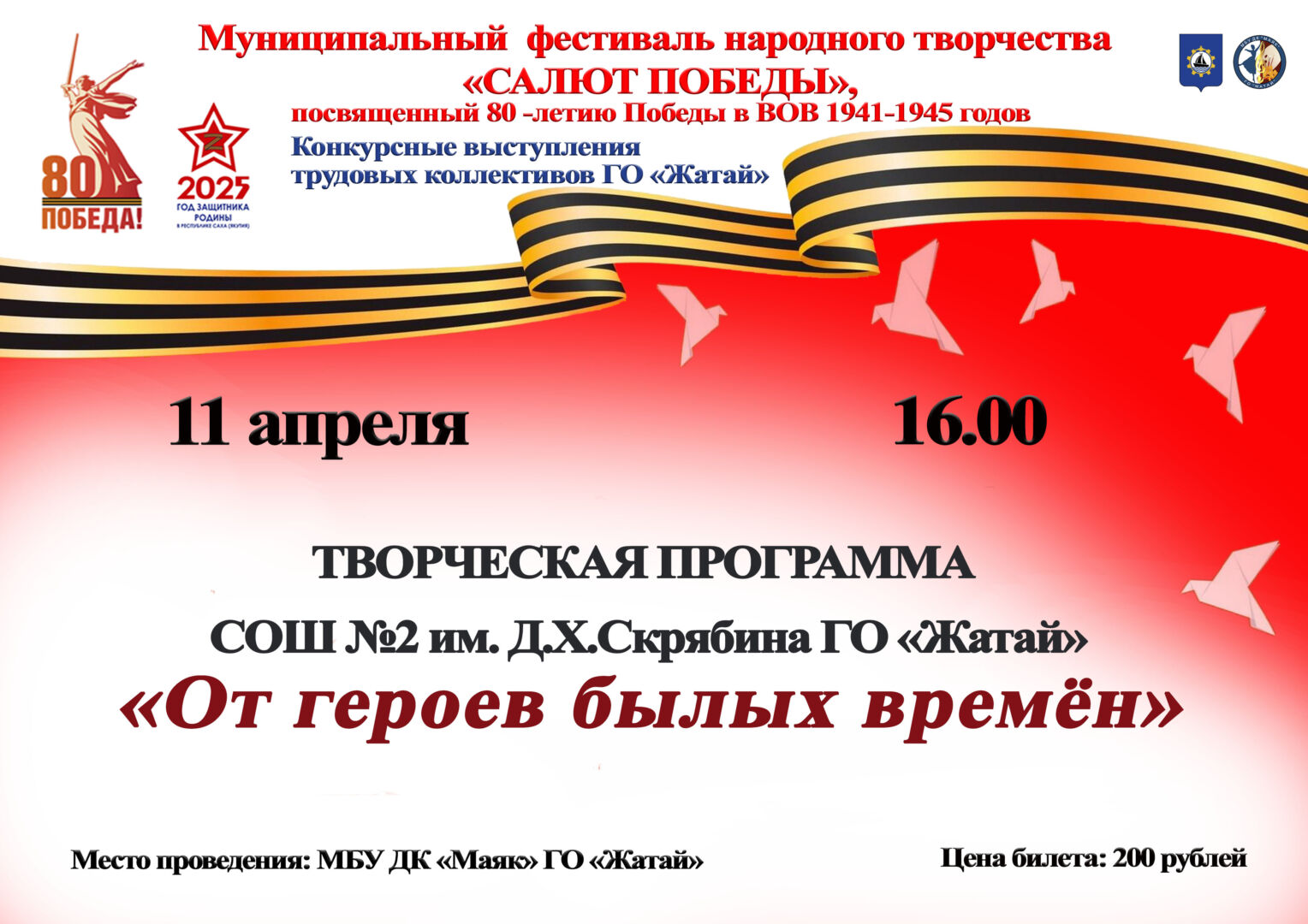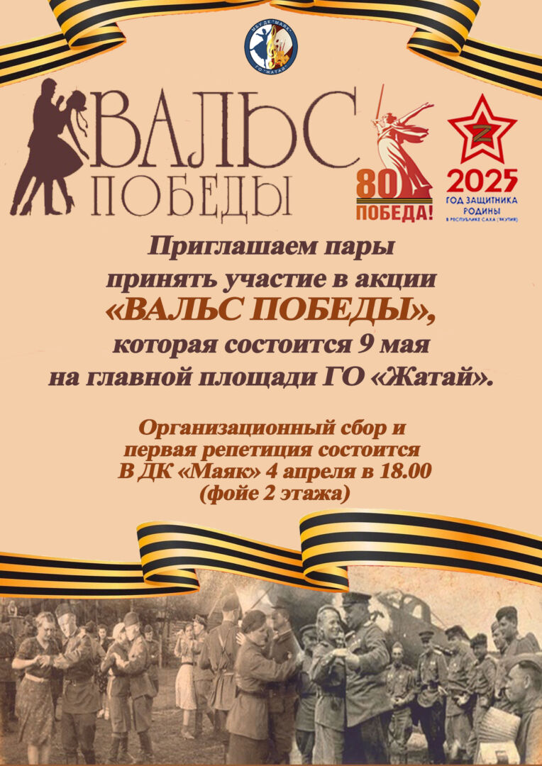 ВАЛЬС ПОБЕДЫ07/04/202574нет Приглашаем пары принять участие в акции «ВАЛЬС ПОБЕДЫ»,которая состоится 9 мая на главной площади ГО «Жатай».Репетиция состоится В ... Метки: