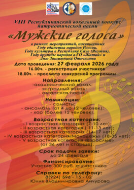 VIII Республиканский вокальный конкурс патриотической песниVIII Республиканский вокальный конкурс патриотической песни «Мужские голоса» в рамках мероприятий, посвященных Году единства народов России, Году культуры в Республике Саха (Якутия),Году дружбы народов в ГО «Жатай» и Дню Защитника Отечества