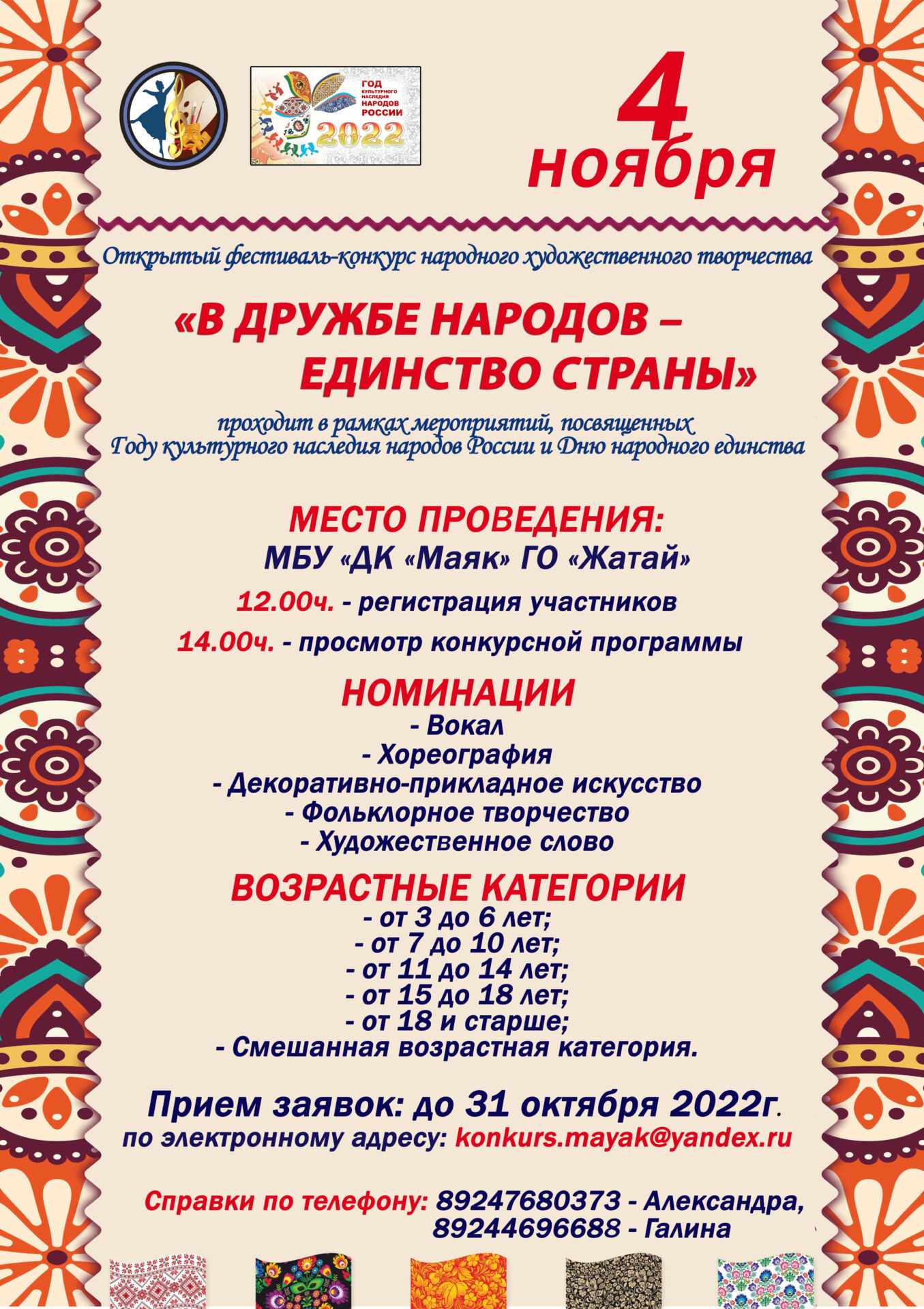 - Заявки на участие в фестивале-конкурсе подаются до 31 октября 2022г. по адресу: п. Жатай, ул. Строда 1/1, ДК «Маяк», кабинет №7, e-mail: konkurs.mayak@yandex.ru