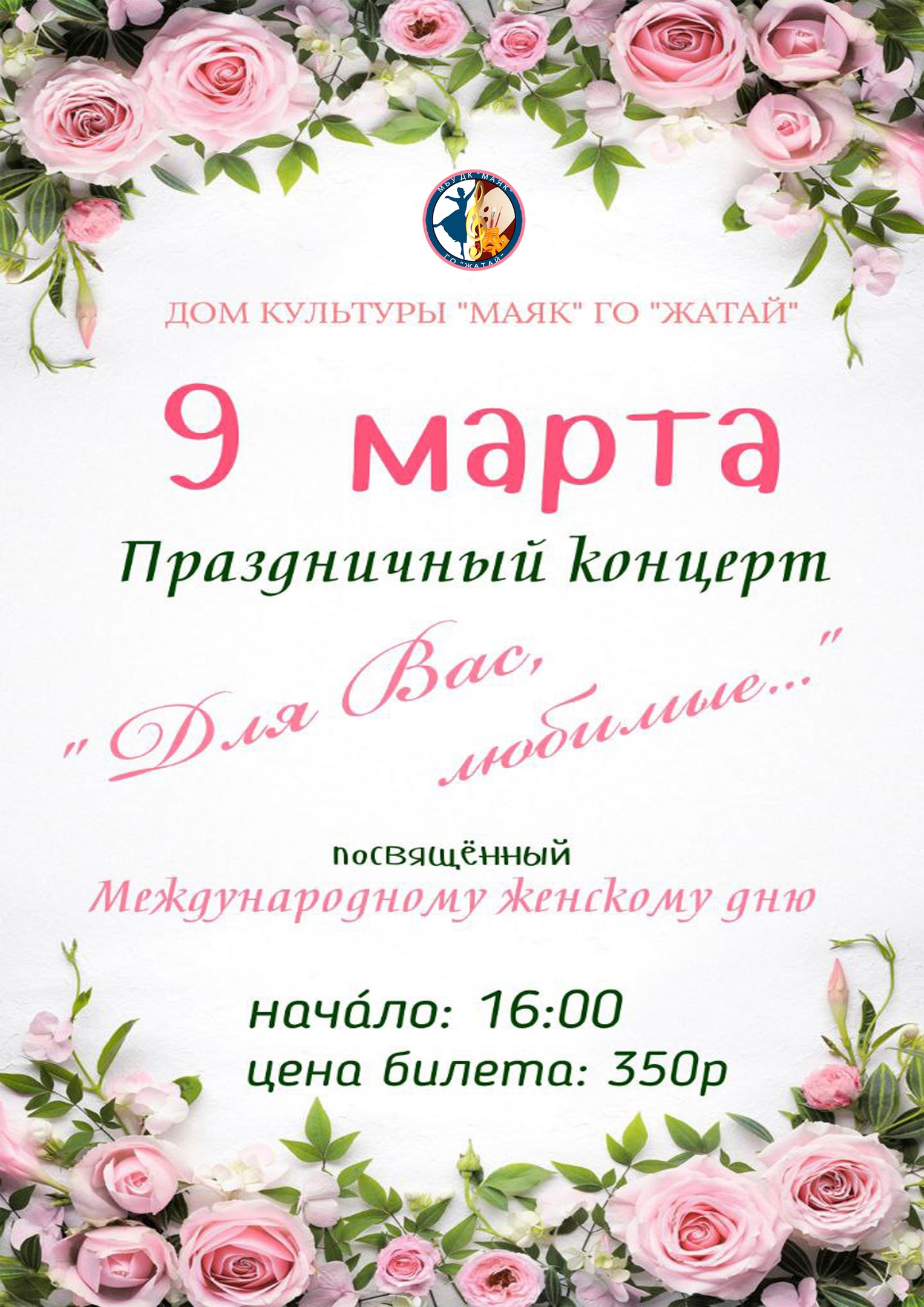 8 марта – Международный женский день, это время, когда прекрасная половина человечества принимает подарки и пожелания в свой адрес. Таким подарком станет праздничный концерт «Для Вас, любимые…», который пройдет в ДК «Маяк» 9 марта в 16.00