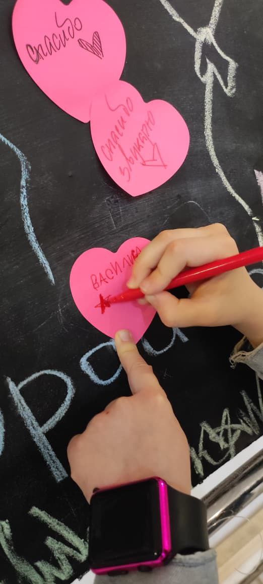 Большая школьная доска, украшенная детскими рисунками мелом, быстро заполнялась разноцветными стикерами.