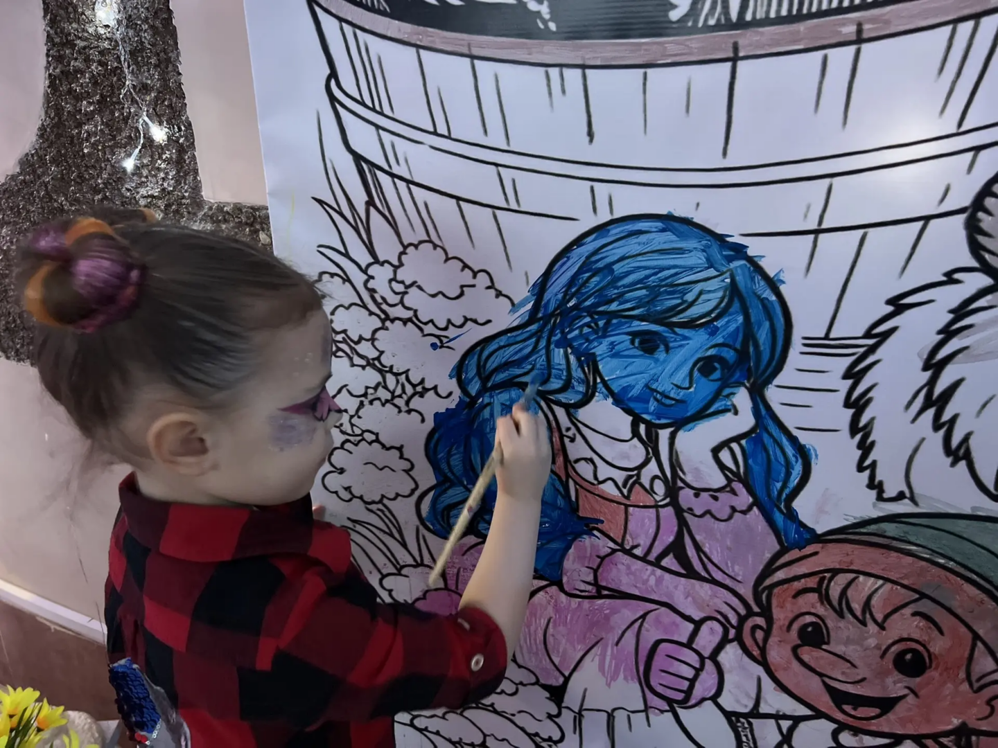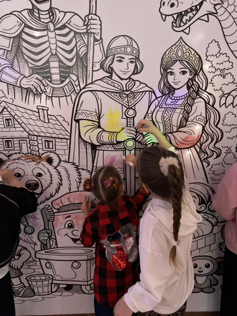 Огромная раскраска стала центром притяжения для юных художников. Дети с удовольствием раскрашивали сказочных персонажей, проявляя свою фантазию и творчество.