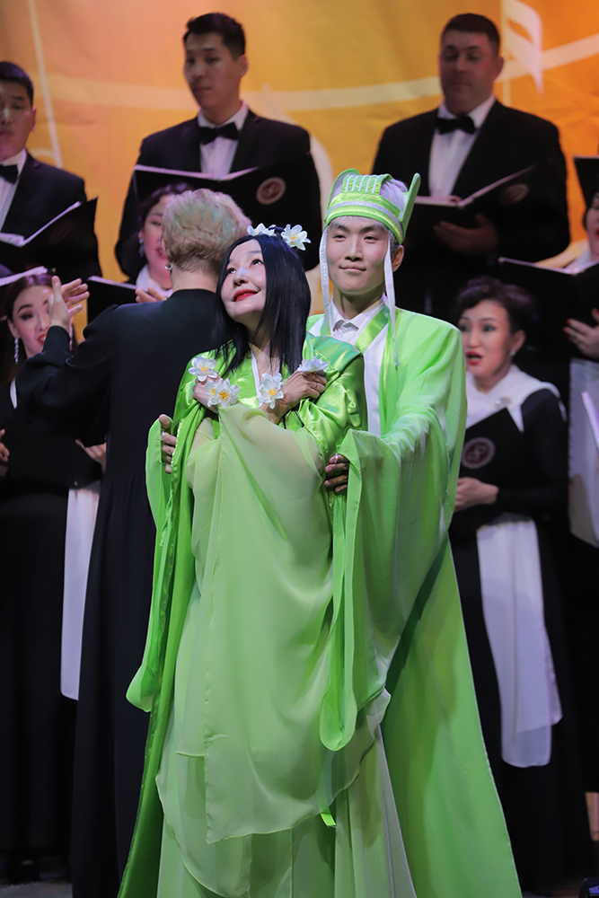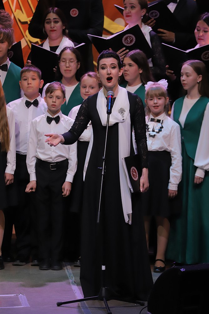 Не менее запоминающим стал тандем хоров Филармонии Якутии и Детской школы искусств Жатая — вместе они исполнили песни «Алёша» Колмановского и «Майский вальс», солистка Кристина Христофорова добавила произведению легкость и выразительность.