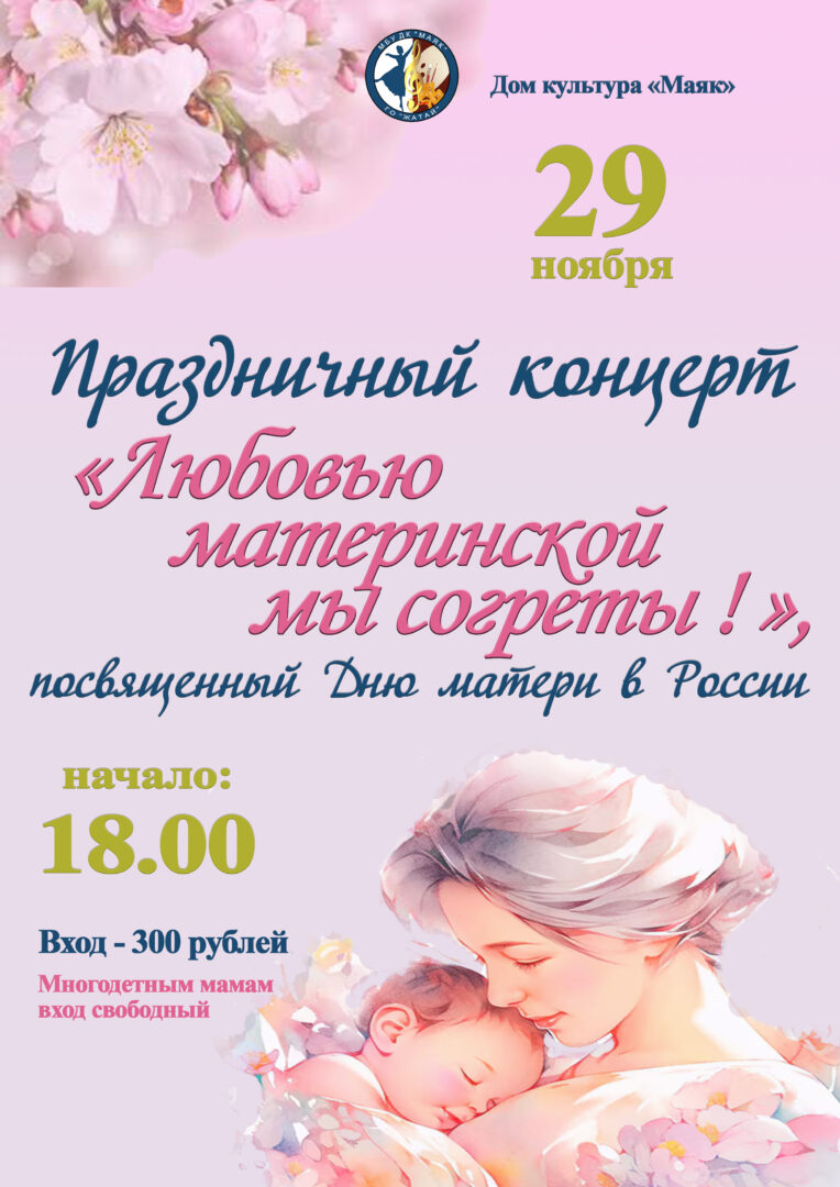 29 ноября в Доме культуры «Маяк» пройдет праздничный концерт, посвященный Дню матери в России. Вход на мероприятие — 300 рублей. Многодетные мамы могут посетить концерт бесплатно при наличии соответствующего документа. Это отличная возможность отметить важность матерей в нашей жизни и насладиться творческой программой. Не упустите шанс провести этот день в теплой и дружеской атмосфере!