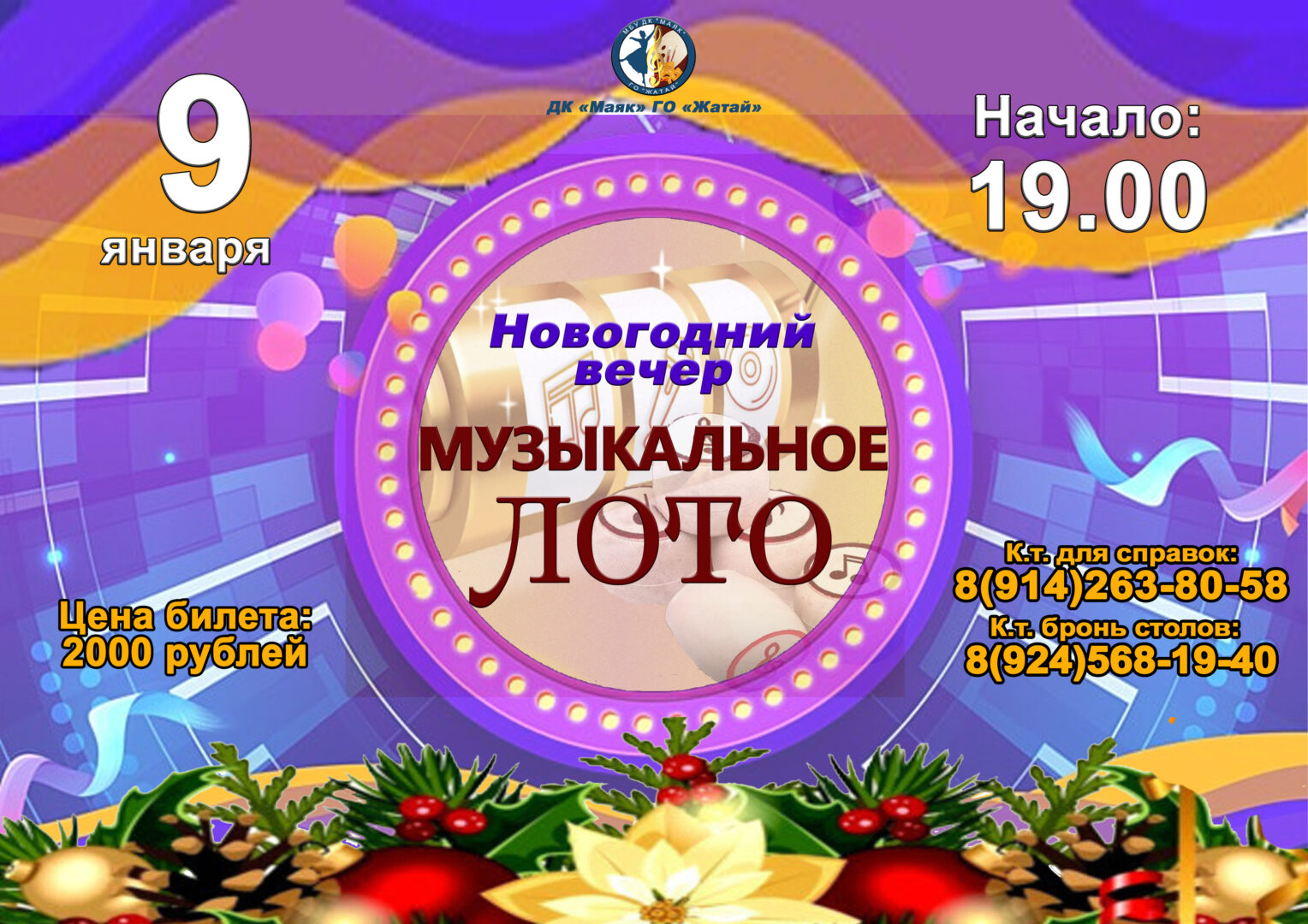 9 января в Доме культуры «Маяк» пройдет Новогодний вечер «Музыкальное лото». Вас ждет насыщенная программа, включающая развлекательные конкурсы, выступления артистов.