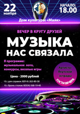 Музыка нас связалаВечер в кругу друзей «Музыка нас связала» Дорогие друзья, мы с радостью приглашаю вас на вечер отдыха, наполненный музыкой, хорошим настроением! Это будет незабываемое время, полное светлых эмоций и теплого общения. Мы с нетерпением ждем вас на вечер отдыха! Прием заявок открыт! Запись ведется по столикам. Справки по телефону: 89142638058