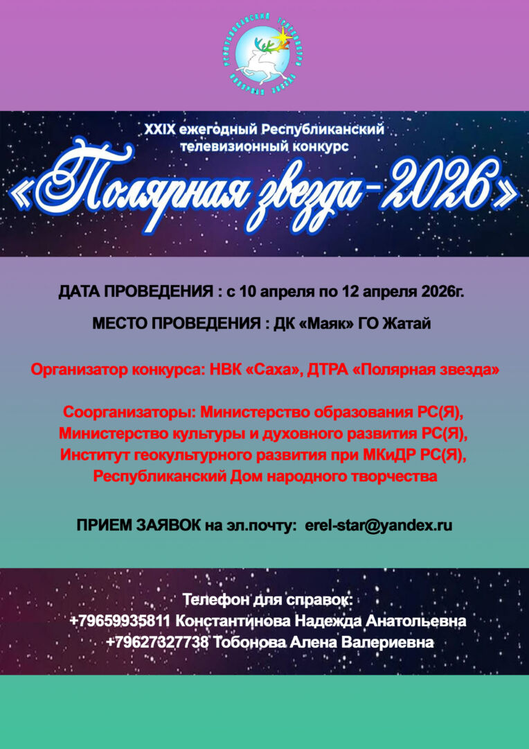 ️«ПОЛЯРНАЯ ЗВЕЗДА-2026» ️Приуроченный к Году единства народов России, Году Культуры в РС(Я). Организатор конкурса: НВК «Саха», ДТРА «Полярная звезда» Соорганизаторы: Министерство образования РС(Я), Министерство культуры и духовного развития РС(Я), Институт геокультурного развития при МКиДР РС(Я), Республиканский Дом народного творчества