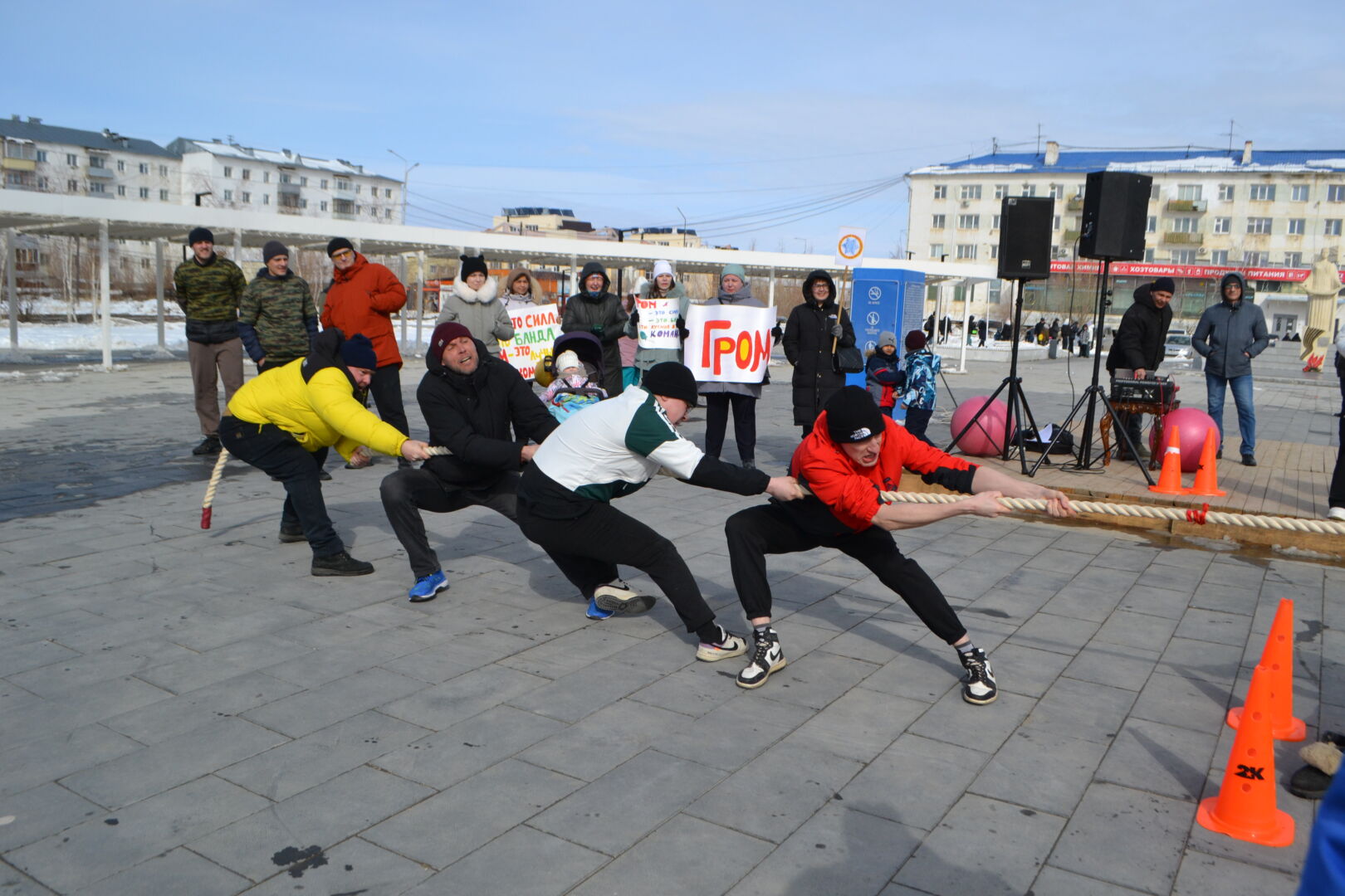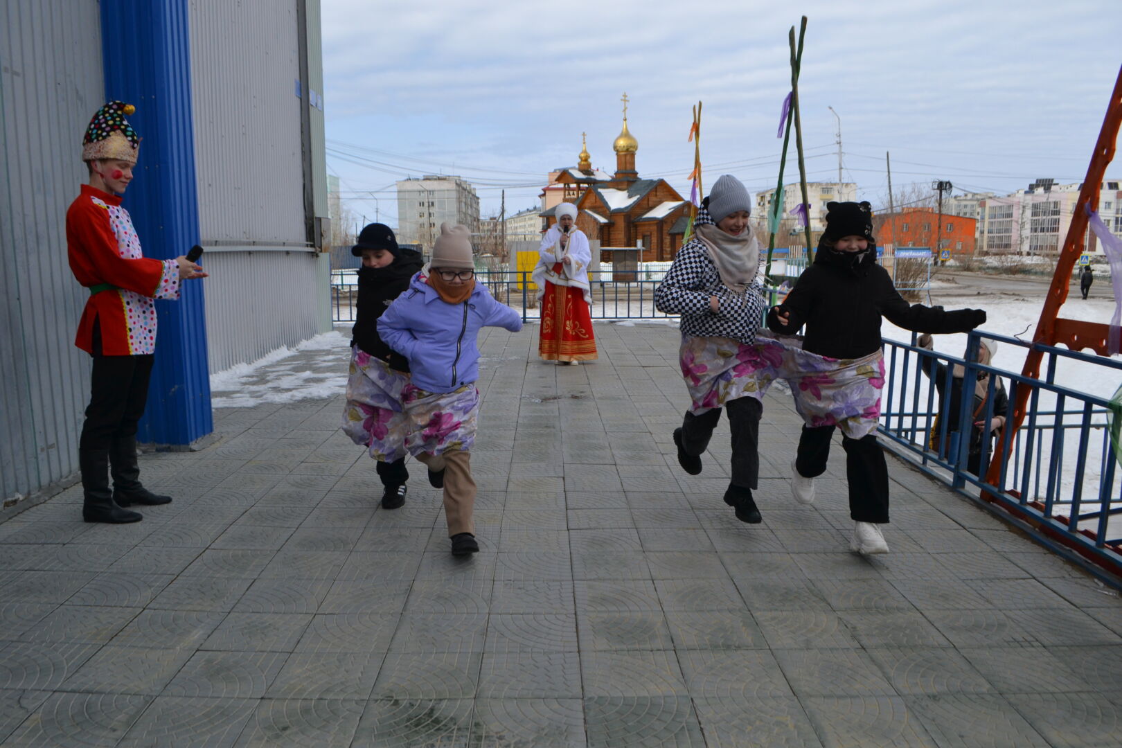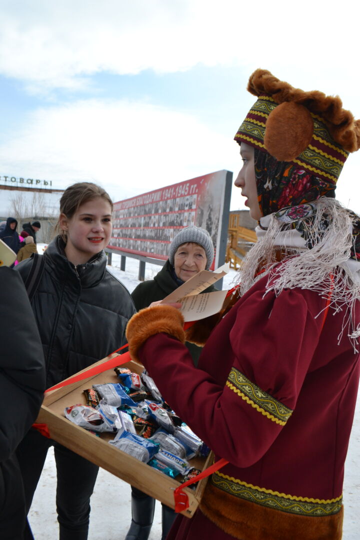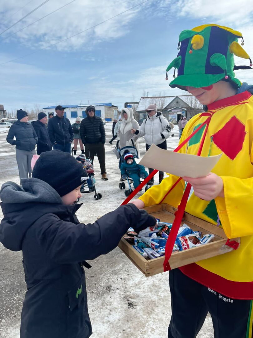 Театрализованное представление открыли веселые скоморохи, затем главные герои праздника Зима со своей свитой, сдала своё правление Весне. На сцене веселил жителей поселка, Петрушка, со своими играми и конкурсами для детей и взрослых, которые соревновались на самого ловкого, меткого, сильного. На центральной площади тренера ДЮСШ провели спортивные состязания.