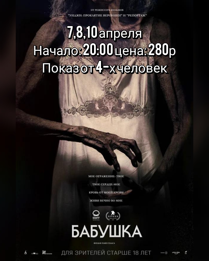 Фильм «Бабушка»01/04/2022134нет Дата показа: 7, 8, 10 апреля 2022Начало: 20:00ч.Цена: 280р. О фильме Сусана строит успешную карьеру модели в Париже. Накануне ... Метки: Ужасы