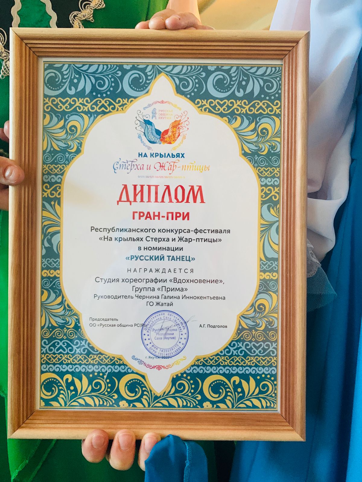 Студия хореографии «Вдохновение», группа «Прима» приняла участие в Республиканском конкурсе-фестивале «На крыльях Стерха и Жар-птицы», где завоевали ГРАН-ПРИ в номинации «Русский танец». Поздравляем руководителя Чернину Галину Иннокентьевну и группу «Прима» с заслуженной наградой.