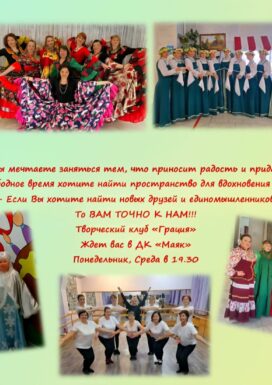Творческий клуб «Грация»Творческий клуб «Грация» приглашает в свой дружный коллектив. Ждем вас в ДК «Маяк» — понедельник, среда в 19.30