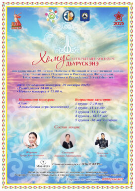 Хомус дьүрүскэнэПОЛОЖЕНИЕ об организации и проведении Республиканского конкурса «Хомус дьүрүскэнэ», посвященного 80-летию Победы в Великой отечественной войне, Году защитника Отечества в Российской Федерации, Году защитника Родины в Республике Саха (Якутия) Требования к конкурсным композициям: -Для участия допускаются композиции только с использованием традиционных приемов исполнения на хомусе; -Каждый ансамбль предоставляет 1 композицию продолжительностью не более 5 минут, […]
